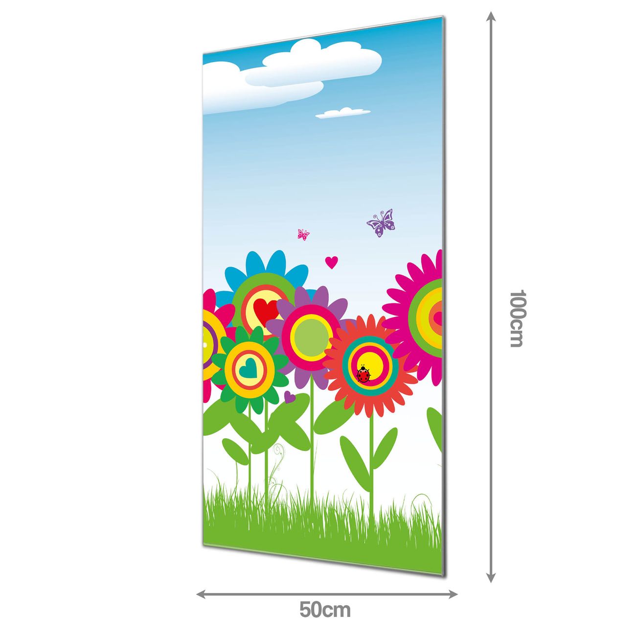 Material: 4mm Sicherheitsglas mit Metallrückwand Eigenschaften: beschreibbar, magnetisch, kratzfest Maße: 50x100x0,6cm, 7,50 kg schwer Motiv Nummer 10227 Bunte Blumen Zubehör: inklusive 4 Neodym-Magnete