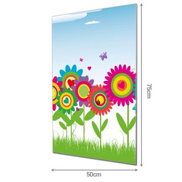 Material: 4mm Sicherheitsglas mit Metallrückwand Eigenschaften: beschreibbar, magnetisch, kratzfest Maße: 50x75x0,6cm, 5,63 kg schwer Motiv Nummer 10227 Bunte Blumen Zubehör: inklusive 4 Neodym-Magnete