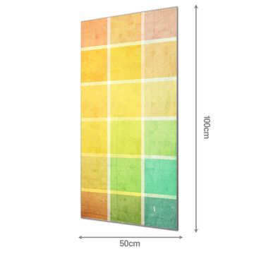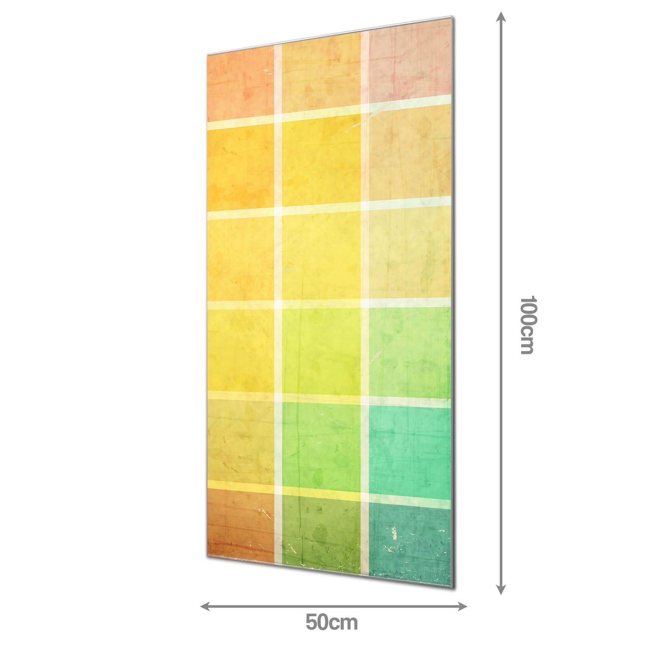 Material: 4mm Sicherheitsglas mit Metallrückwand Eigenschaften: beschreibbar, magnetisch, kratzfest Maße: 50x100x0,6cm, 7,50 kg schwer Motiv Nummer 11329 Bunte Glasbausteine Zubehör: inklusive 4 Neodym-Magnete