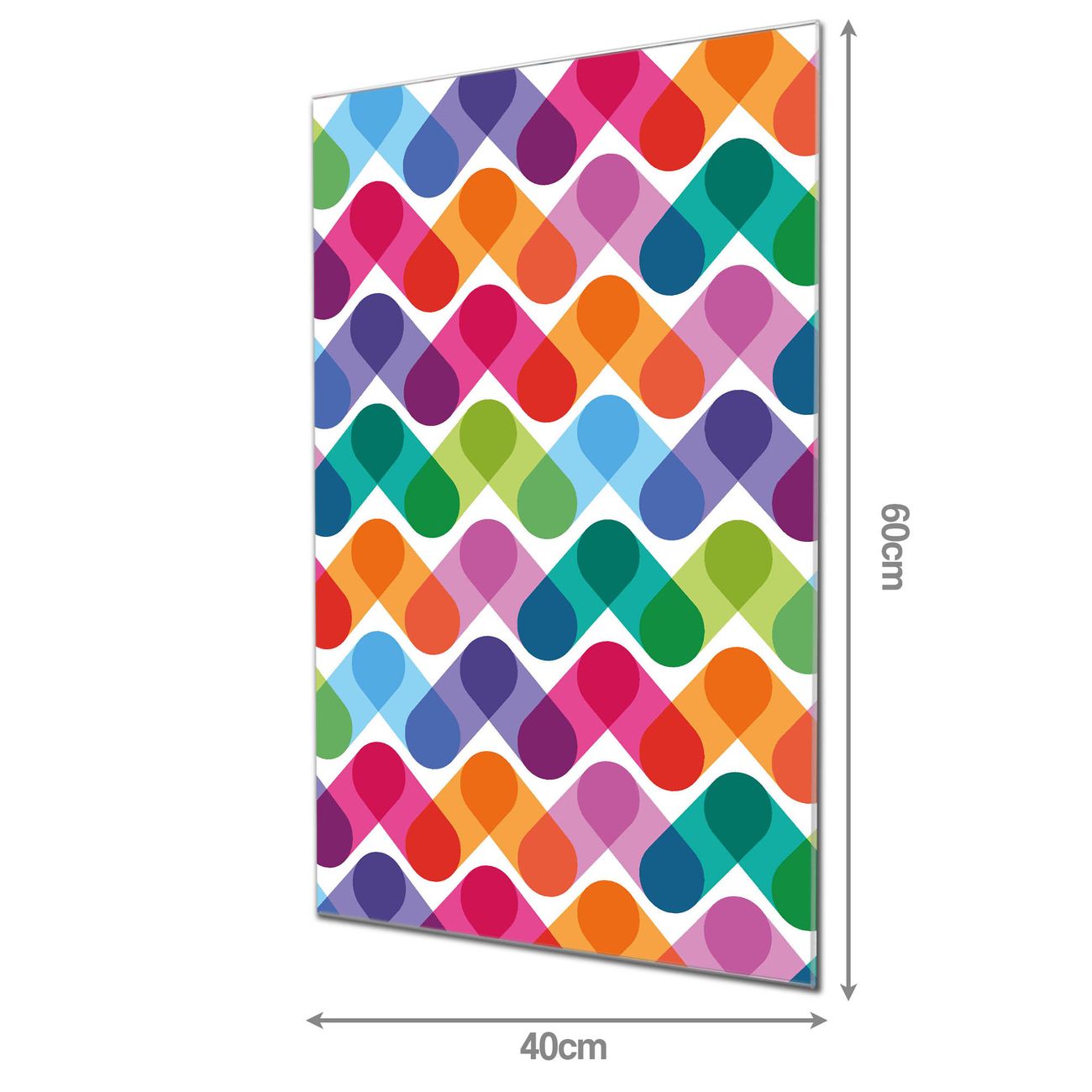 Material: 4mm Sicherheitsglas mit Metallrückwand Eigenschaften: beschreibbar, magnetisch, kratzfest Maße: 40x60x0,6cm, 3,60 kg schwer Motiv Nummer 12184 Bunte Ketten Zubehör: inklusive 4 Neodym-Magnete