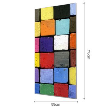 Material: 4mm Sicherheitsglas mit Metallrückwand Eigenschaften: beschreibbar, magnetisch, kratzfest Maße: 55x110x0,6cm, 9,08 kg schwer Motiv Nummer 10185 Bunte Kreide Zubehör: inklusive 4 Neodym-Magnete