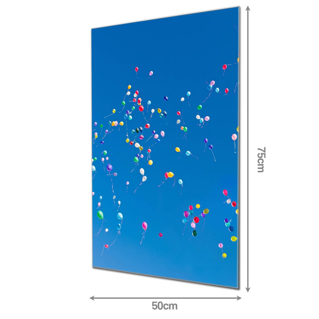 Material: 4mm Sicherheitsglas mit Metallrückwand Eigenschaften: beschreibbar, magnetisch, kratzfest Maße: 50x75x0,6cm, 5,63 kg schwer Motiv Nummer 12505 Bunte Luftballons Zubehör: inklusive 4 Neodym-Magnete