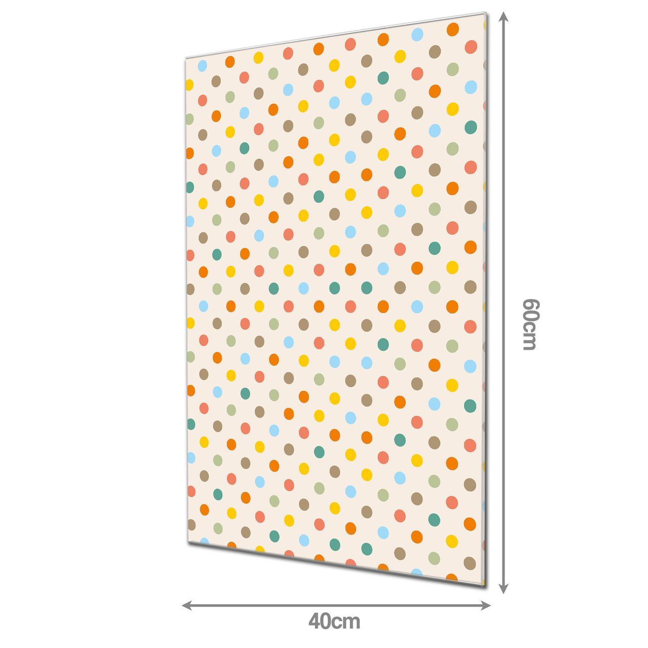 Material: 4mm Sicherheitsglas mit Metallrückwand Eigenschaften: beschreibbar, magnetisch, kratzfest Maße: 40x60x0,6cm, 3,60 kg schwer Motiv Nummer 11360 Bunte Punkte Zubehör: inklusive 4 Neodym-Magnete