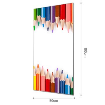Material: 4mm Sicherheitsglas mit Metallrückwand Eigenschaften: beschreibbar, magnetisch, kratzfest Maße: 50x100x0,6cm, 7,50 kg schwer Motiv Nummer 10052 Buntstifte Zubehör: inklusive 4 Neodym-Magnete