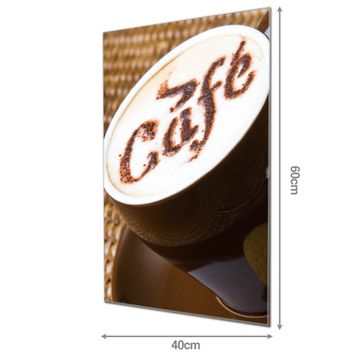 Material: 4mm Sicherheitsglas mit Metallrückwand Eigenschaften: beschreibbar, magnetisch, kratzfest Maße: 40x60x0,6cm, 3,60 kg schwer Motiv Nummer 10093 Cafe Zubehör: inklusive 4 Neodym-Magnete