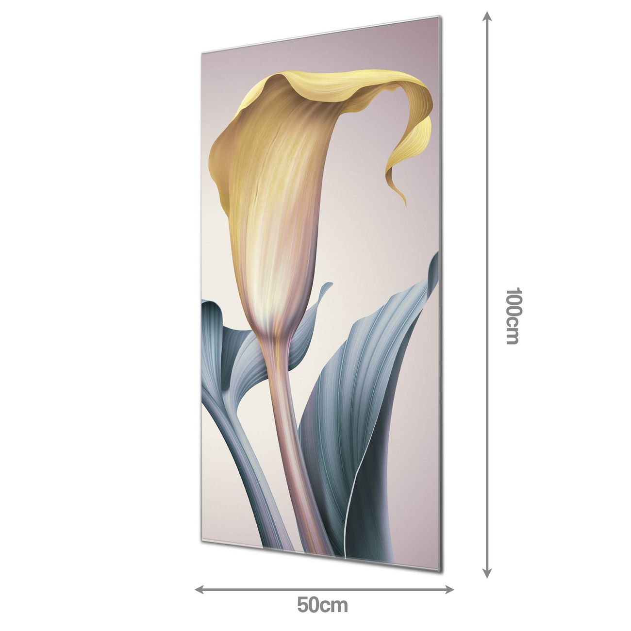 Material: 4mm Sicherheitsglas mit Metallrückwand Eigenschaften: beschreibbar, magnetisch, kratzfest Maße: 50x100x0,6cm, 7,50 kg schwer Motiv Nummer 12339 Calla Zubehör: inklusive 4 Neodym-Magnete