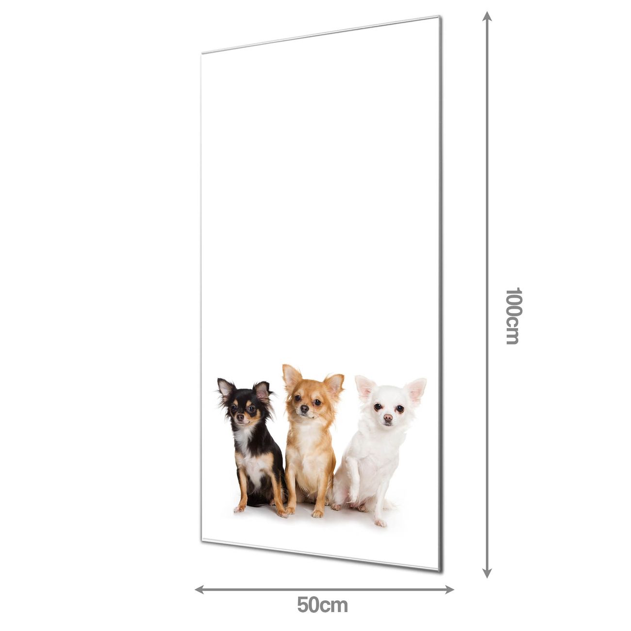 Material: 4mm Sicherheitsglas mit Metallrückwand Eigenschaften: beschreibbar, magnetisch, kratzfest Maße: 50x100x0,6cm, 7,50 kg schwer Motiv Nummer 10005 Chihuahua Zubehör: inklusive 4 Neodym-Magnete