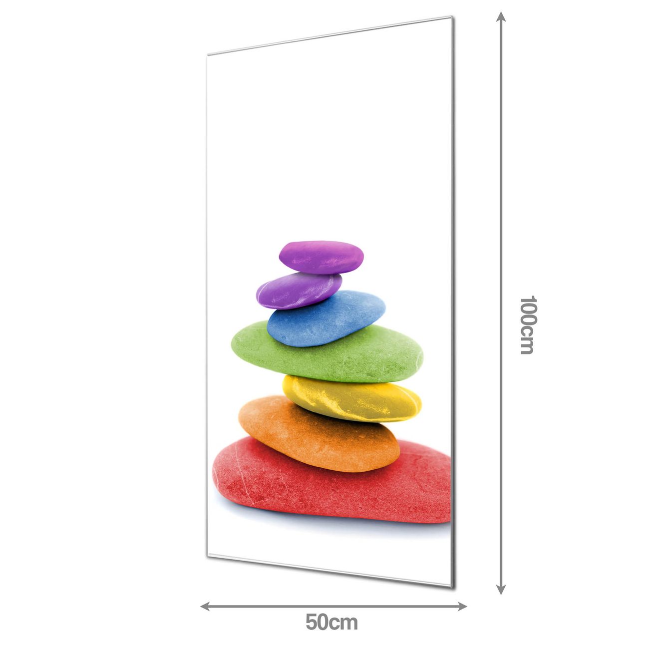 Material: 4mm Sicherheitsglas mit Metallrückwand Eigenschaften: beschreibbar, magnetisch, kratzfest Maße: 50x100x0,6cm, 7,50 kg schwer Motiv Nummer 10158 Coloured Stone Zubehör: inklusive 4 Neodym-Magnete