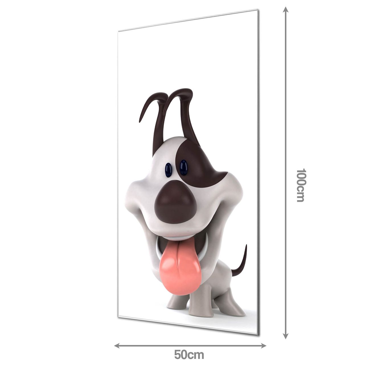 Material: 4mm Sicherheitsglas mit Metallrückwand Eigenschaften: beschreibbar, magnetisch, kratzfest Maße: 50x100x0,6cm, 7,50 kg schwer Motiv Nummer 10245 Comic-Hund Zubehör: inklusive 4 Neodym-Magnete