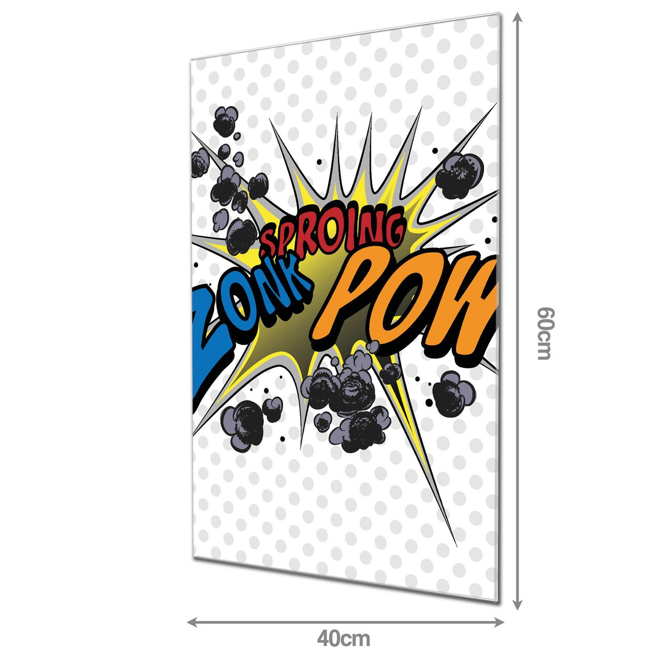Material: 4mm Sicherheitsglas mit Metallrückwand Eigenschaften: beschreibbar, magnetisch, kratzfest Maße: 40x60x0,6cm, 3,60 kg schwer Motiv Nummer 10278 Comic Zubehör: inklusive 4 Neodym-Magnete