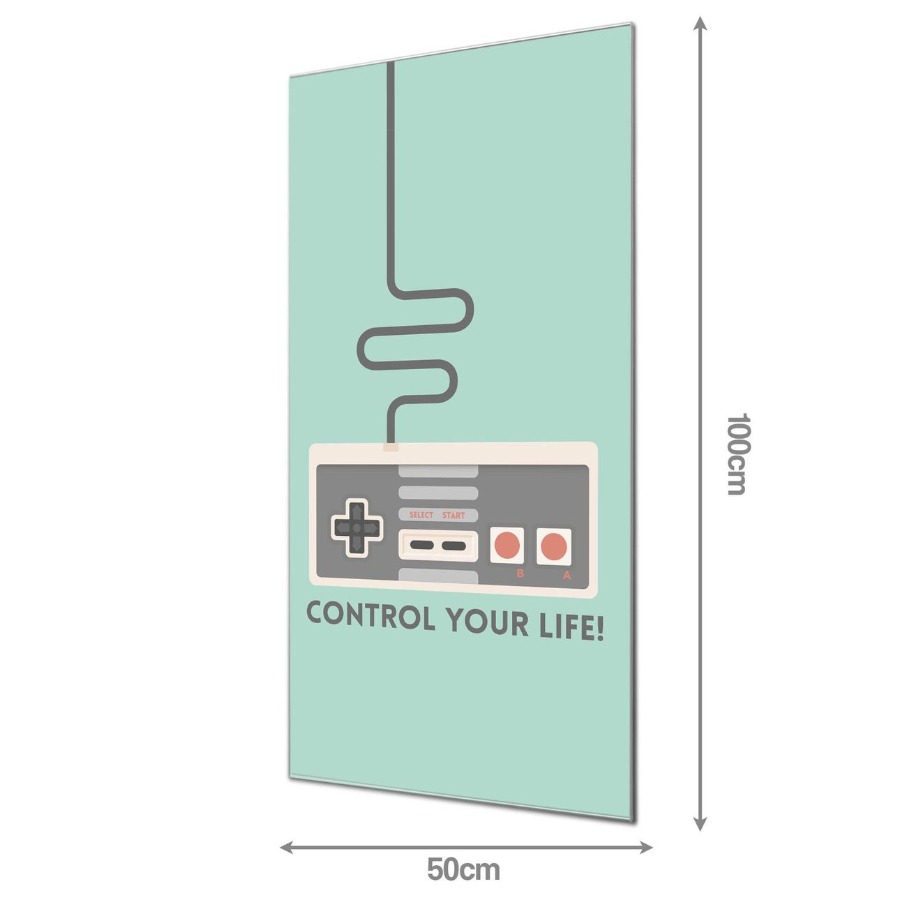 Material: 4mm Sicherheitsglas mit Metallrückwand Eigenschaften: beschreibbar, magnetisch, kratzfest Maße: 50x100x0,6cm, 7,50 kg schwer Motiv Nummer 12476 Control Zubehör: inklusive 4 Neodym-Magnete