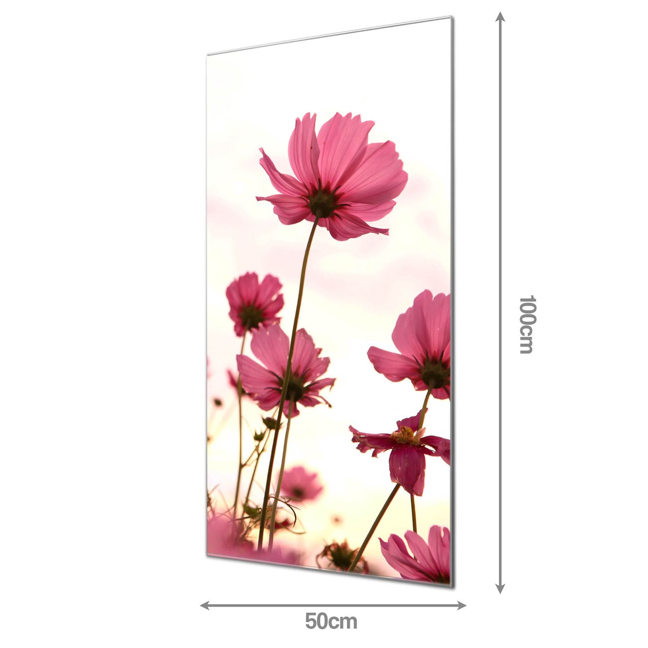 Material: 4mm Sicherheitsglas mit Metallrückwand Eigenschaften: beschreibbar, magnetisch, kratzfest Maße: 50x100x0,6cm, 7,50 kg schwer Motiv Nummer 12257 Cosmea Zubehör: inklusive 4 Neodym-Magnete