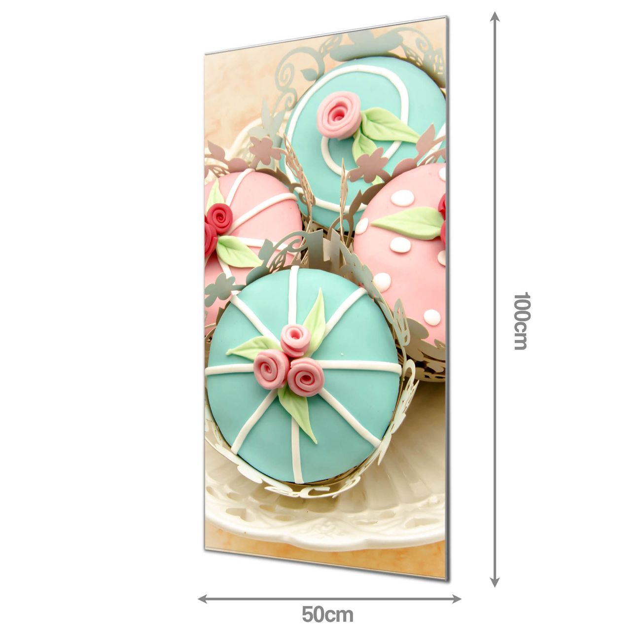 Material: 4mm Sicherheitsglas mit Metallrückwand Eigenschaften: beschreibbar, magnetisch, kratzfest Maße: 50x100x0,6cm, 7,50 kg schwer Motiv Nummer 10544 Cupcakes Zubehör: inklusive 4 Neodym-Magnete