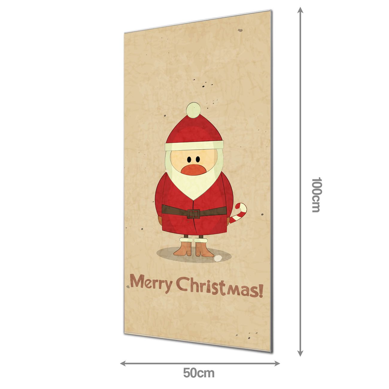 Material: 4mm Sicherheitsglas mit Metallrückwand Eigenschaften: beschreibbar, magnetisch, kratzfest Maße: 50x100x0,6cm, 7,50 kg schwer Motiv Nummer 10836 Cute Claus Zubehör: inklusive 4 Neodym-Magnete