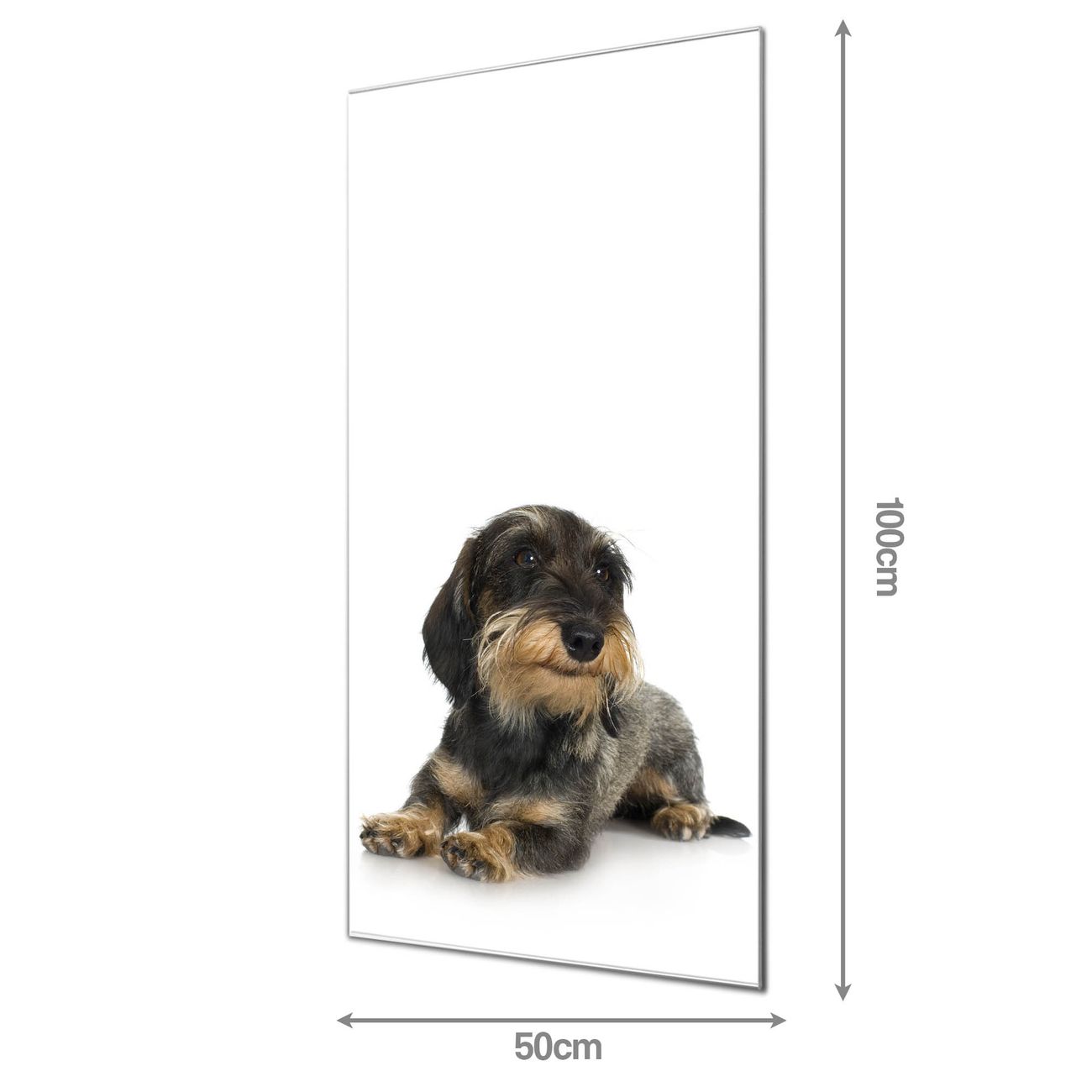 Material: 4mm Sicherheitsglas mit Metallrückwand Eigenschaften: beschreibbar, magnetisch, kratzfest Maße: 50x100x0,6cm, 7,50 kg schwer Motiv Nummer 10150 Dackel Zubehör: inklusive 4 Neodym-Magnete