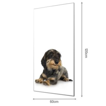 Material: 4mm Sicherheitsglas mit Metallrückwand Eigenschaften: beschreibbar, magnetisch, kratzfest Maße: 60x120x0,6cm, 10,80 kg schwer Motiv Nummer 10150 Dackel Zubehör: inklusive 4 Neodym-Magnete