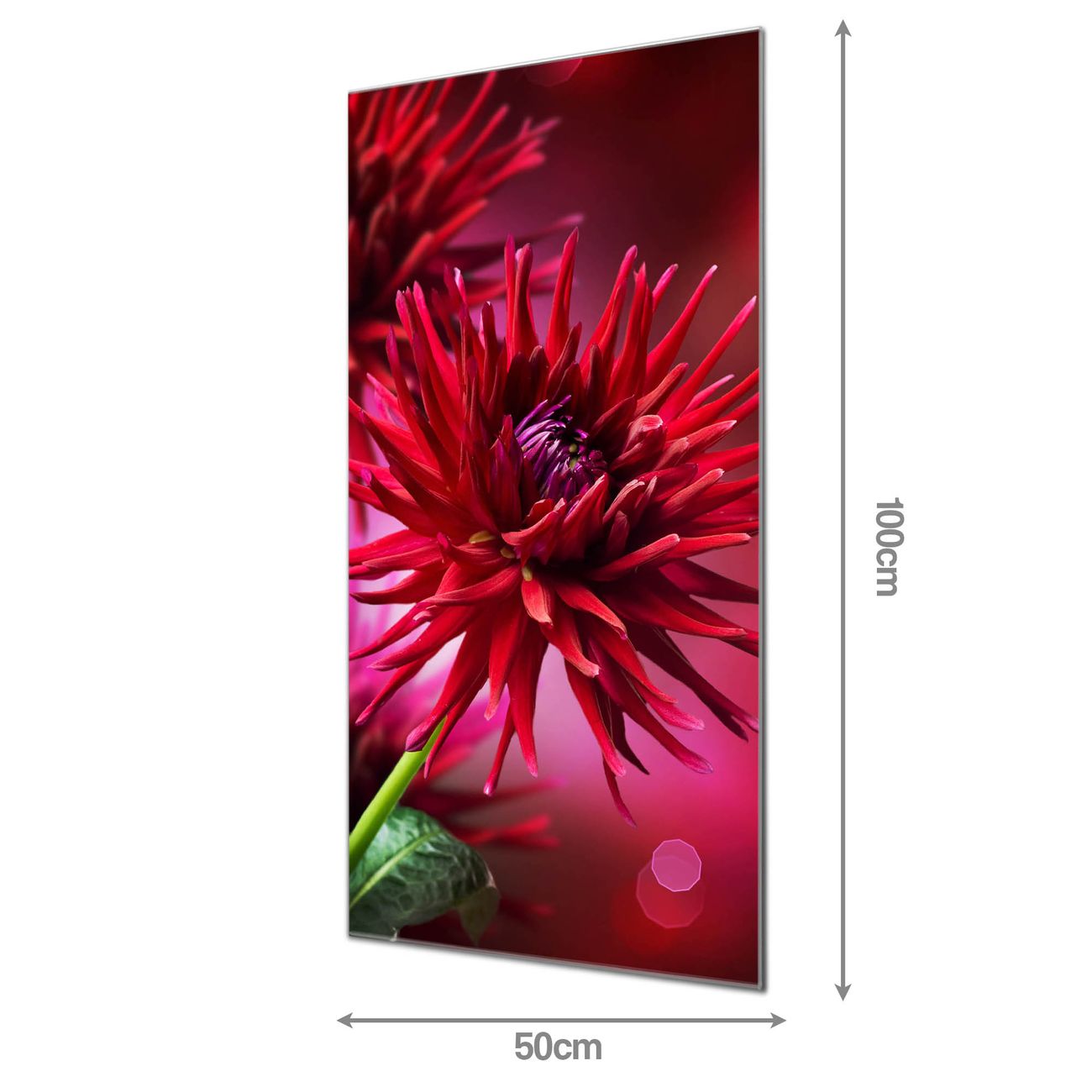 Material: 4mm Sicherheitsglas mit Metallrückwand Eigenschaften: beschreibbar, magnetisch, kratzfest Maße: 50x100x0,6cm, 7,50 kg schwer Motiv Nummer 10423 Rote Dahlien Zubehör: inklusive 4 Neodym-Magnete
