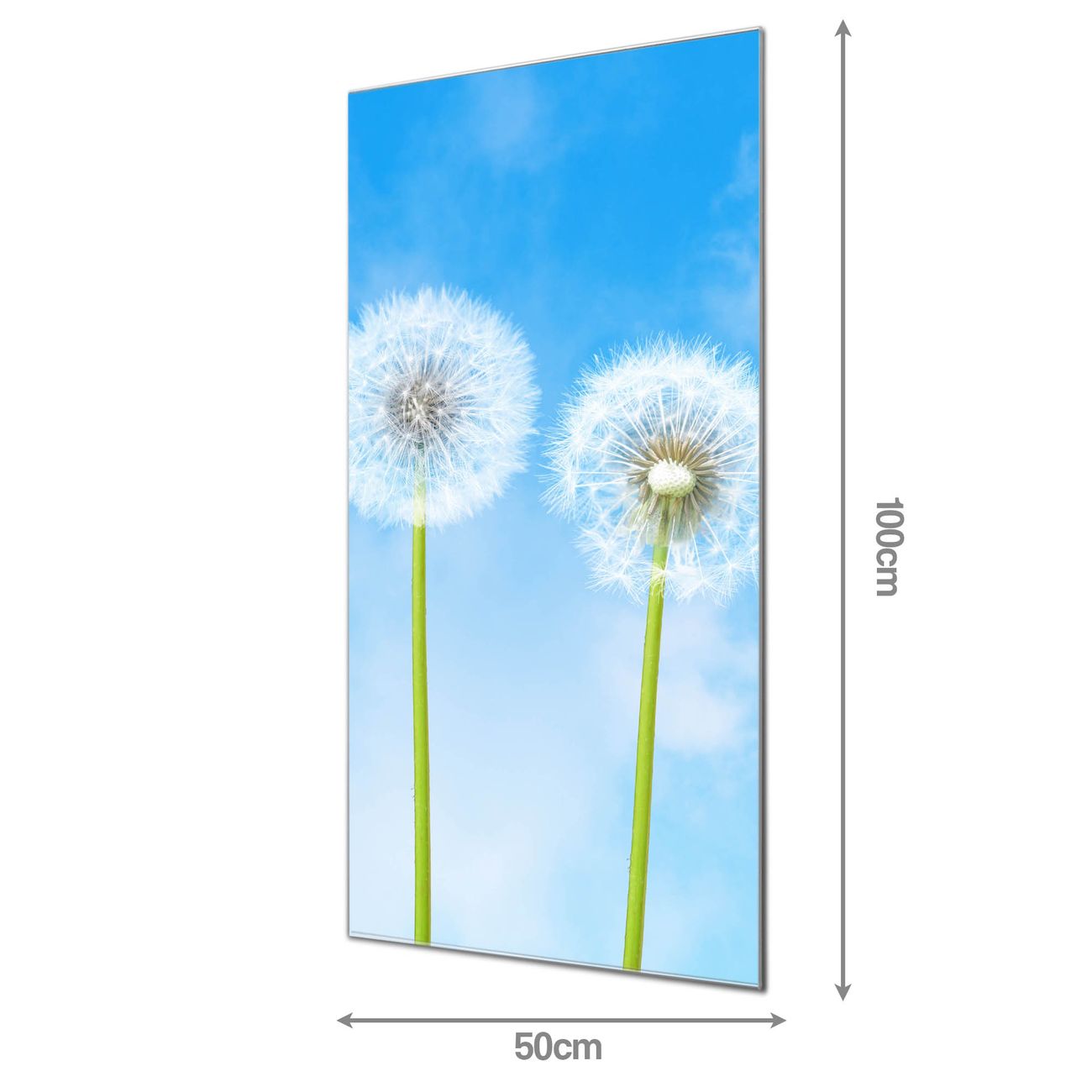 Material: 4mm Sicherheitsglas mit Metallrückwand Eigenschaften: beschreibbar, magnetisch, kratzfest Maße: 50x100x0,6cm, 7,50 kg schwer Motiv Nummer 10174 Dandelion Zubehör: inklusive 4 Neodym-Magnete