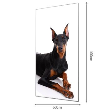 Material: 4mm Sicherheitsglas mit Metallrückwand Eigenschaften: beschreibbar, magnetisch, kratzfest Maße: 50x100x0,6cm, 7,50 kg schwer Motiv Nummer 10067 Dobermann Zubehör: inklusive 4 Neodym-Magnete