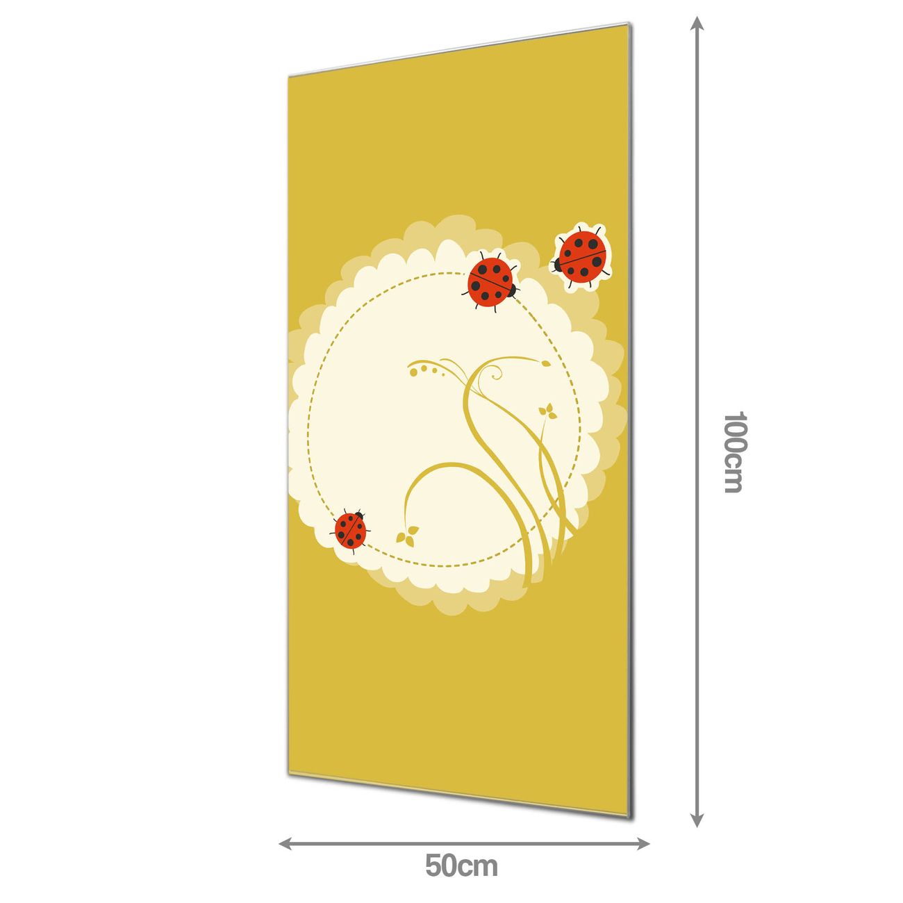 Material: 4mm Sicherheitsglas mit Metallrückwand Eigenschaften: beschreibbar, magnetisch, kratzfest Maße: 50x100x0,6cm, 7,50 kg schwer Motiv Nummer 10945 Drei Marienkäfer Zubehör: inklusive 4 Neodym-Magnete