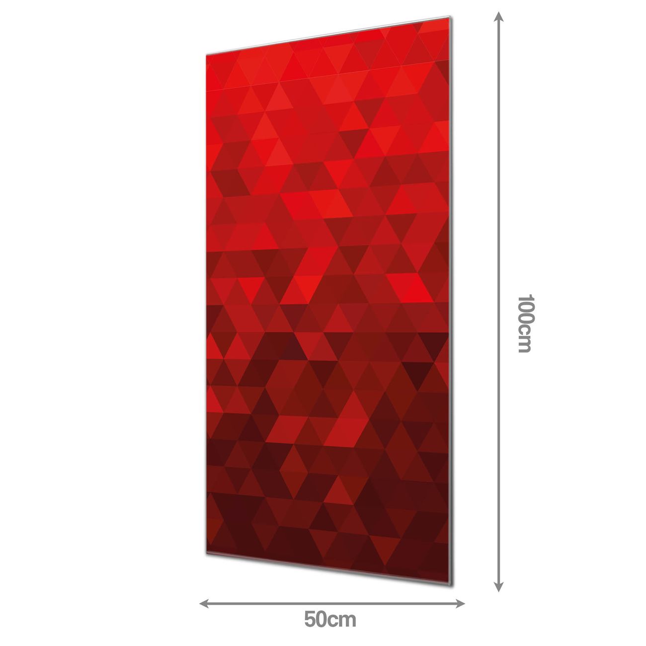 Material: 4mm Sicherheitsglas mit Metallrückwand Eigenschaften: beschreibbar, magnetisch, kratzfest Maße: 50x100x0,6cm, 7,50 kg schwer Motiv Nummer 10949 Dreiecke Rot Zubehör: inklusive 4 Neodym-Magnete