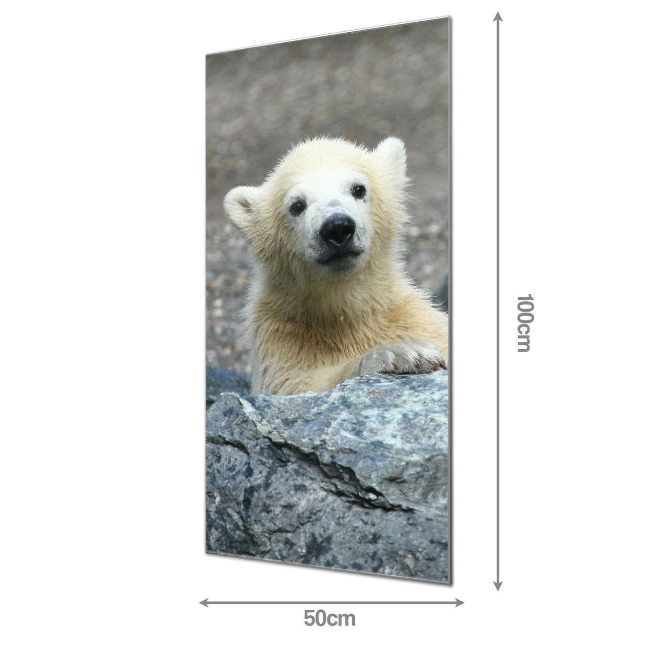 Material: 4mm Sicherheitsglas mit Metallrückwand Eigenschaften: beschreibbar, magnetisch, kratzfest Maße: 50x100x0,6cm, 7,50 kg schwer Motiv Nummer 10038 Eisbär Baby Zubehör: inklusive 4 Neodym-Magnete
