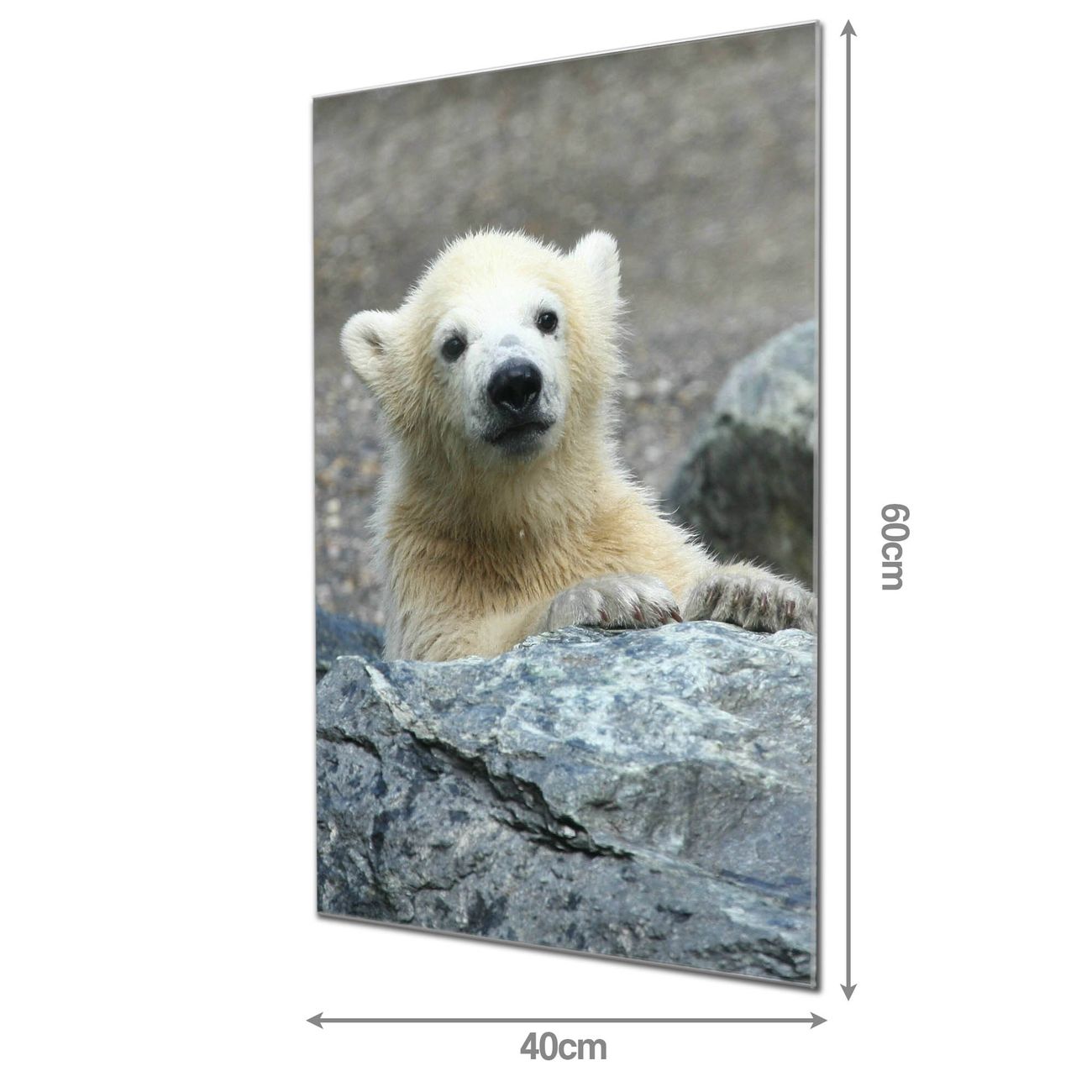 Material: 4mm Sicherheitsglas mit Metallrückwand Eigenschaften: beschreibbar, magnetisch, kratzfest Maße: 40x60x0,6cm, 3,60 kg schwer Motiv Nummer 10038 Eisbär Baby Zubehör: inklusive 4 Neodym-Magnete