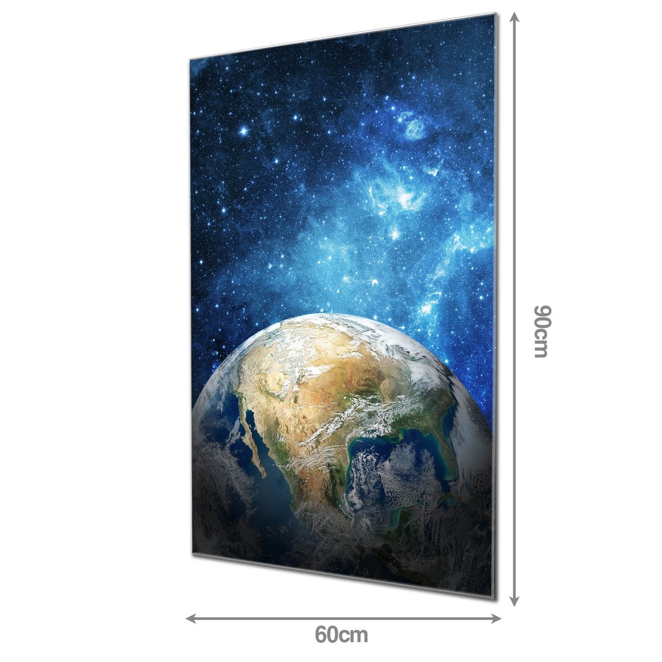 Material: 4mm Sicherheitsglas mit Metallrückwand Eigenschaften: beschreibbar, magnetisch, kratzfest Maße: 60x90x0,6cm, 8,10 kg schwer Motiv Nummer 10643 Erdkugel Zubehör: inklusive 4 Neodym-Magnete