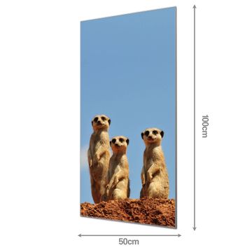 Material: 4mm Sicherheitsglas mit Metallrückwand Eigenschaften: beschreibbar, magnetisch, kratzfest Maße: 50x100x0,6cm, 7,50 kg schwer Motiv Nummer 10297 Erdmännchenfamilie Zubehör: inklusive 4 Neodym-Magnete