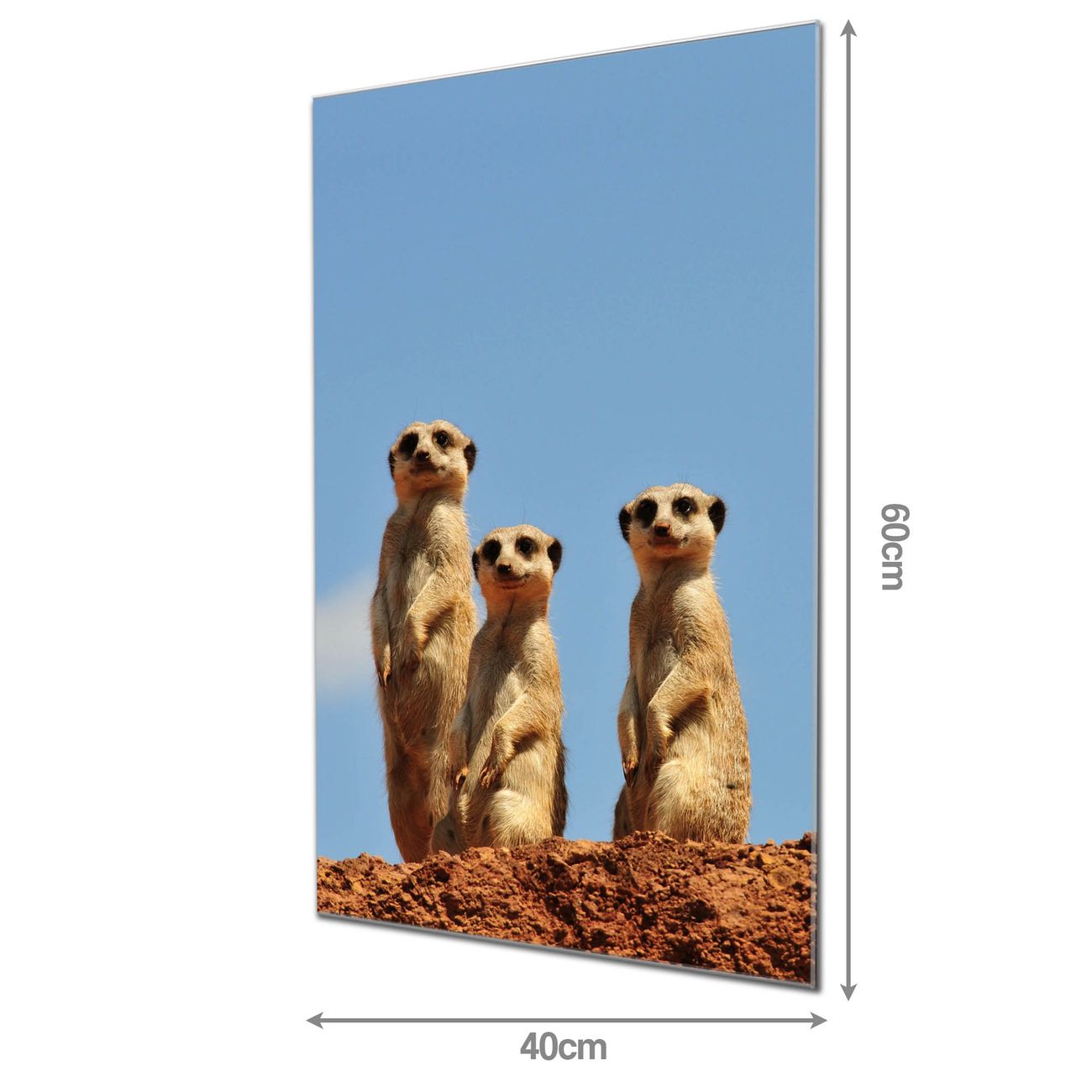 Material: 4mm Sicherheitsglas mit Metallrückwand Eigenschaften: beschreibbar, magnetisch, kratzfest Maße: 40x60x0,6cm, 3,60 kg schwer Motiv Nummer 10297 Erdmännchenfamilie Zubehör: inklusive 4 Neodym-Magnete