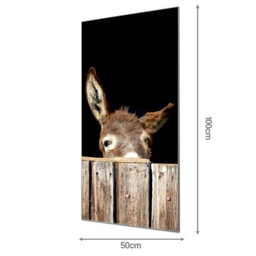 Material: 4mm Sicherheitsglas mit Metallrückwand Eigenschaften: beschreibbar, magnetisch, kratzfest Maße: 50x100x0,6cm, 7,50 kg schwer Motiv Nummer 10472 Esel Zubehör: inklusive 4 Neodym-Magnete