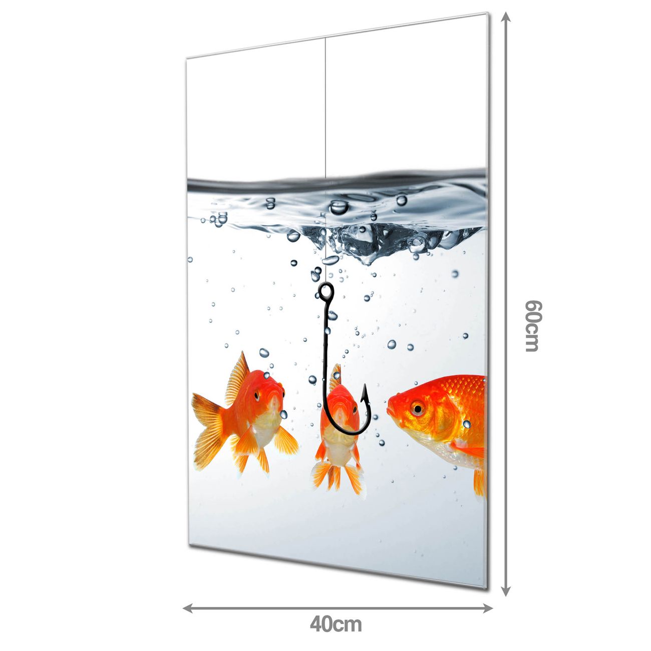 Material: 4mm Sicherheitsglas mit Metallrückwand Eigenschaften: beschreibbar, magnetisch, kratzfest Maße: 40x60x0,6cm, 3,60 kg schwer Motiv Nummer 10184 Fische Zubehör: inklusive 4 Neodym-Magnete