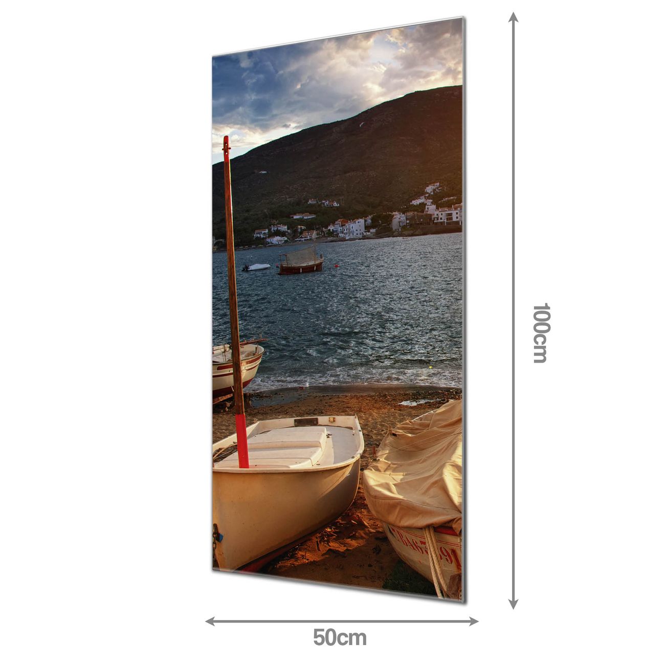 Material: 4mm Sicherheitsglas mit Metallrückwand Eigenschaften: beschreibbar, magnetisch, kratzfest Maße: 50x100x0,6cm, 7,50 kg schwer Motiv Nummer 10557 Fischerboote Zubehör: inklusive 4 Neodym-Magnete