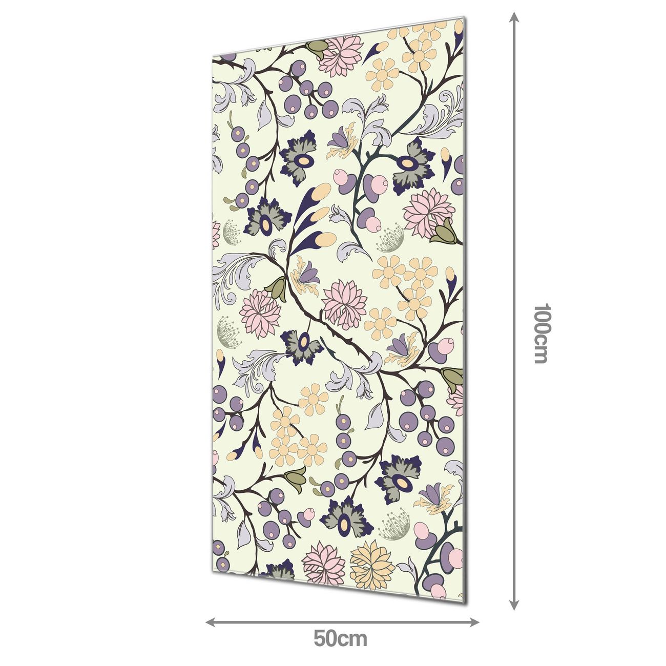 Material: 4mm Sicherheitsglas mit Metallrückwand Eigenschaften: beschreibbar, magnetisch, kratzfest Maße: 50x100x0,6cm, 7,50 kg schwer Motiv Nummer 10552 Florale Tapete Zubehör: inklusive 4 Neodym-Magnete