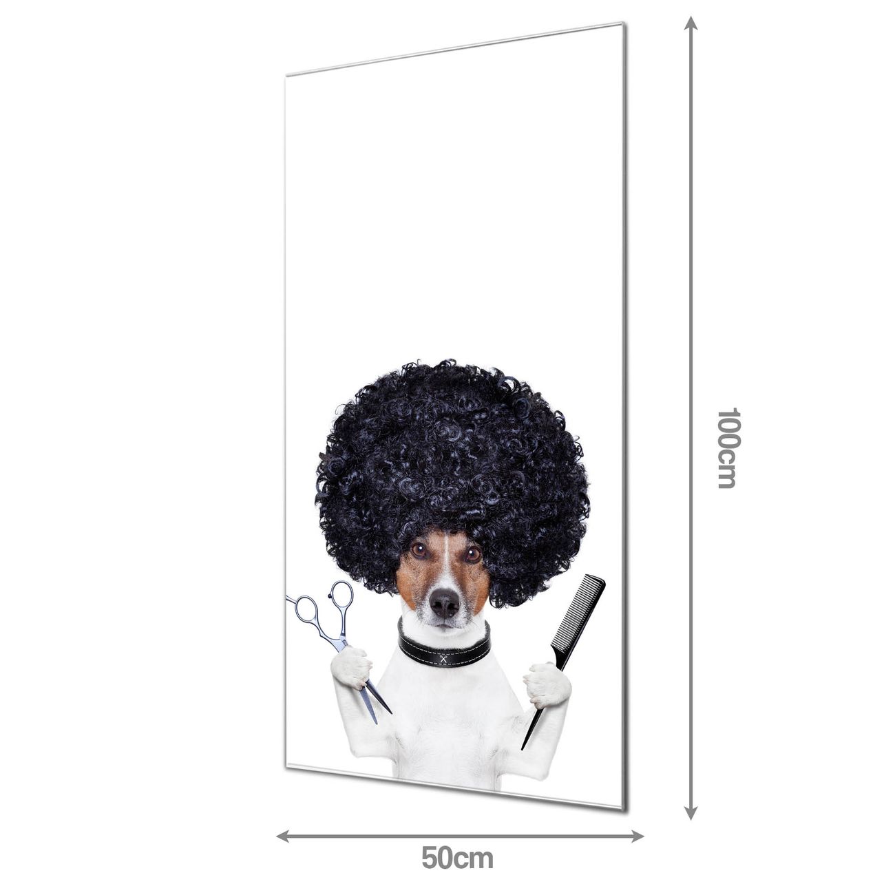 Material: 4mm Sicherheitsglas mit Metallrückwand Eigenschaften: beschreibbar, magnetisch, kratzfest Maße: 50x100x0,6cm, 7,50 kg schwer Motiv Nummer 10651 Friseur Jack Russel Zubehör: inklusive 4 Neodym-Magnete