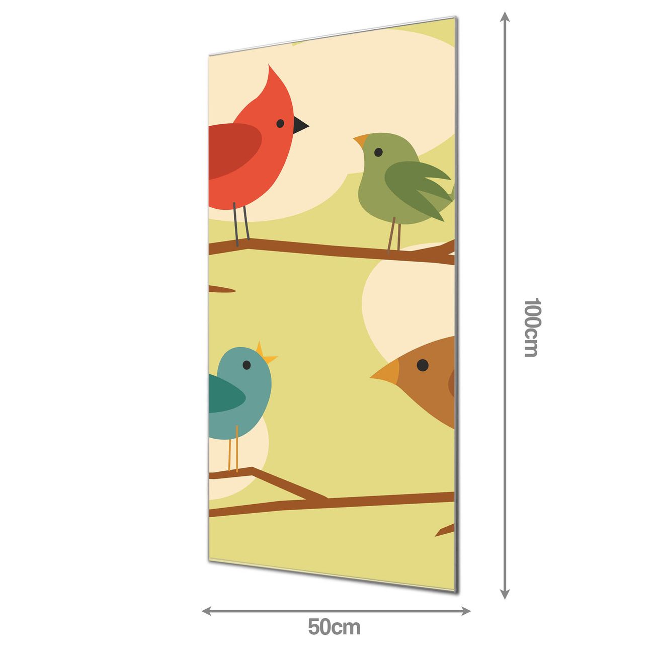 Material: 4mm Sicherheitsglas mit Metallrückwand Eigenschaften: beschreibbar, magnetisch, kratzfest Maße: 50x100x0,6cm, 7,50 kg schwer Motiv Nummer 10890 Fünf Vögel Zubehör: inklusive 4 Neodym-Magnete