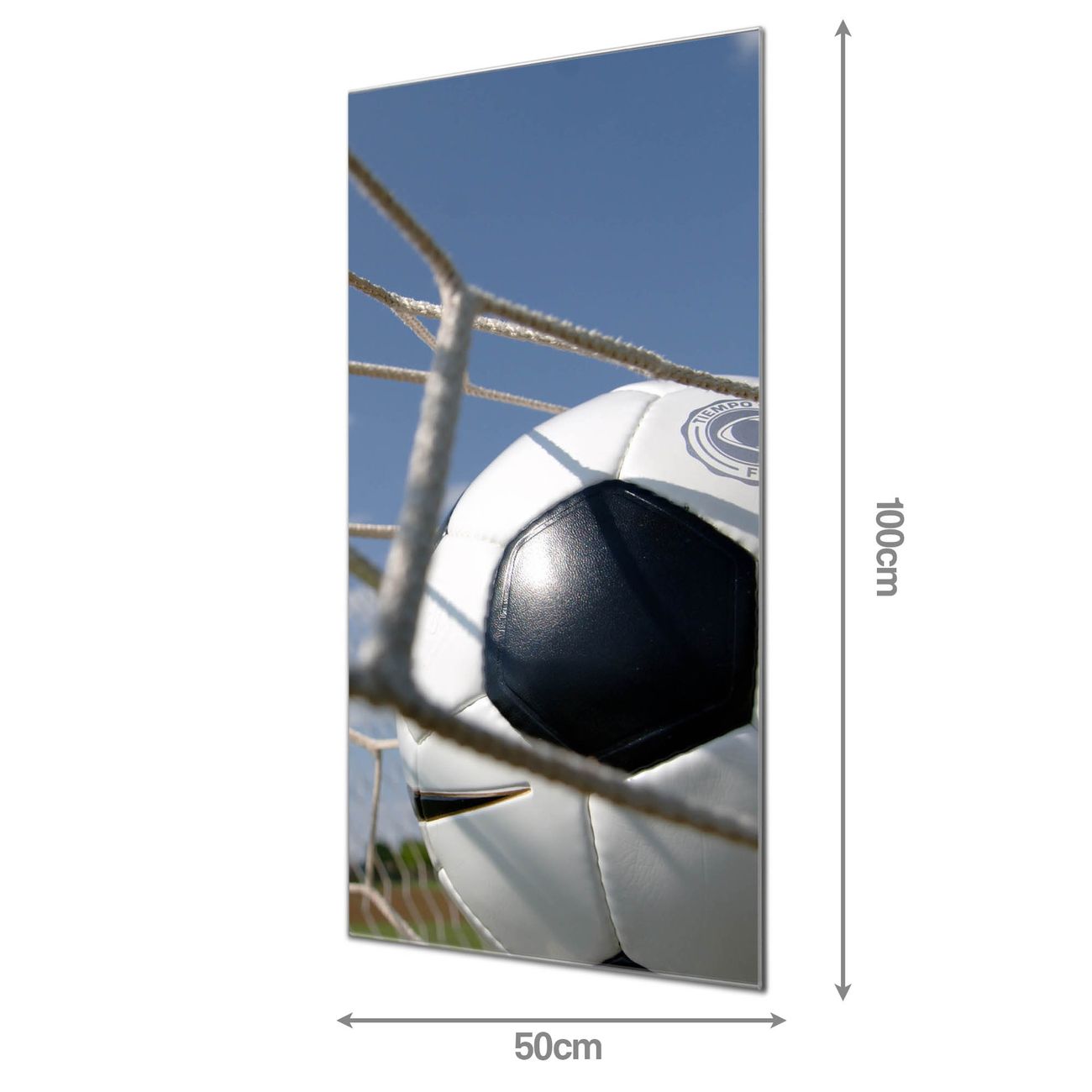 Material: 4mm Sicherheitsglas mit Metallrückwand Eigenschaften: beschreibbar, magnetisch, kratzfest Maße: 50x100x0,6cm, 7,50 kg schwer Motiv Nummer 10097 Fußball Zubehör: inklusive 4 Neodym-Magnete