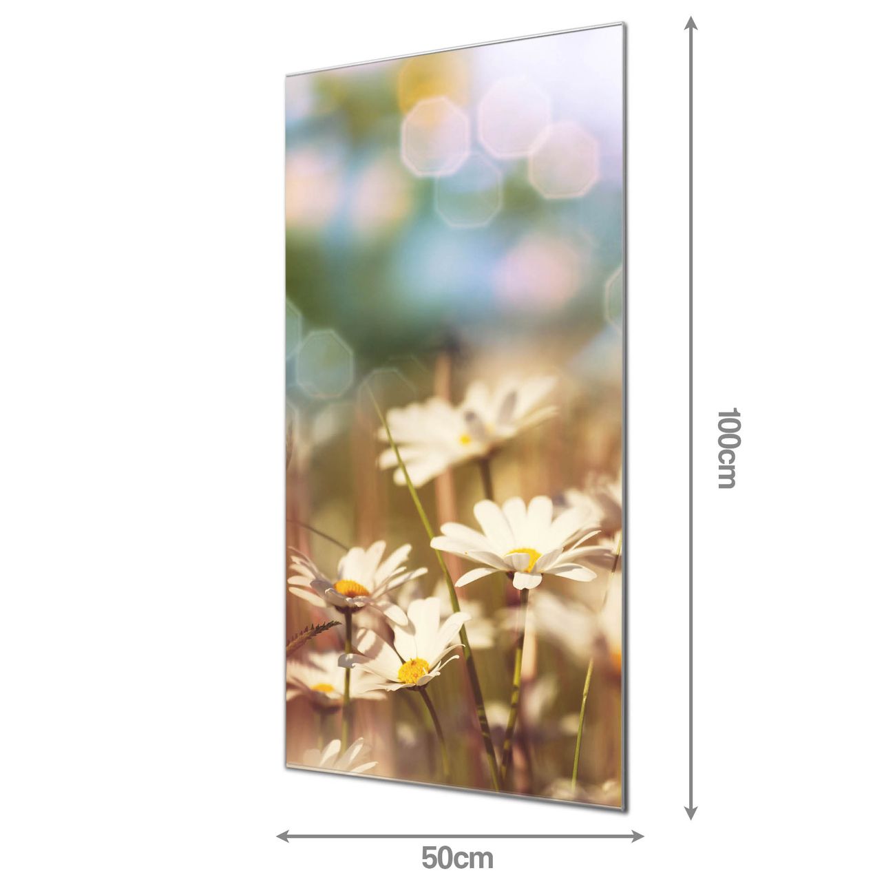 Material: 4mm Sicherheitsglas mit Metallrückwand Eigenschaften: beschreibbar, magnetisch, kratzfest Maße: 50x100x0,6cm, 7,50 kg schwer Motiv Nummer 11403 Tausendschönwiese Zubehör: inklusive 4 Neodym-Magnete