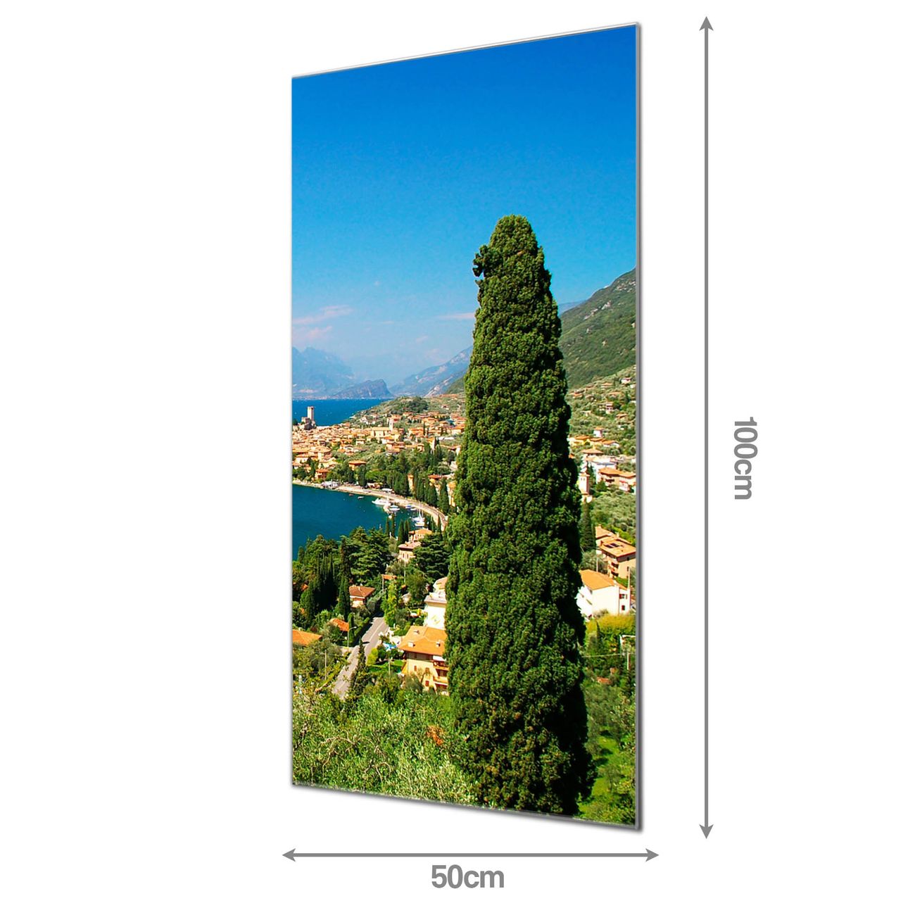 Material: 4mm Sicherheitsglas mit Metallrückwand Eigenschaften: beschreibbar, magnetisch, kratzfest Maße: 50x100x0,6cm, 7,50 kg schwer Motiv Nummer 10009 Gardasee Zubehör: inklusive 4 Neodym-Magnete