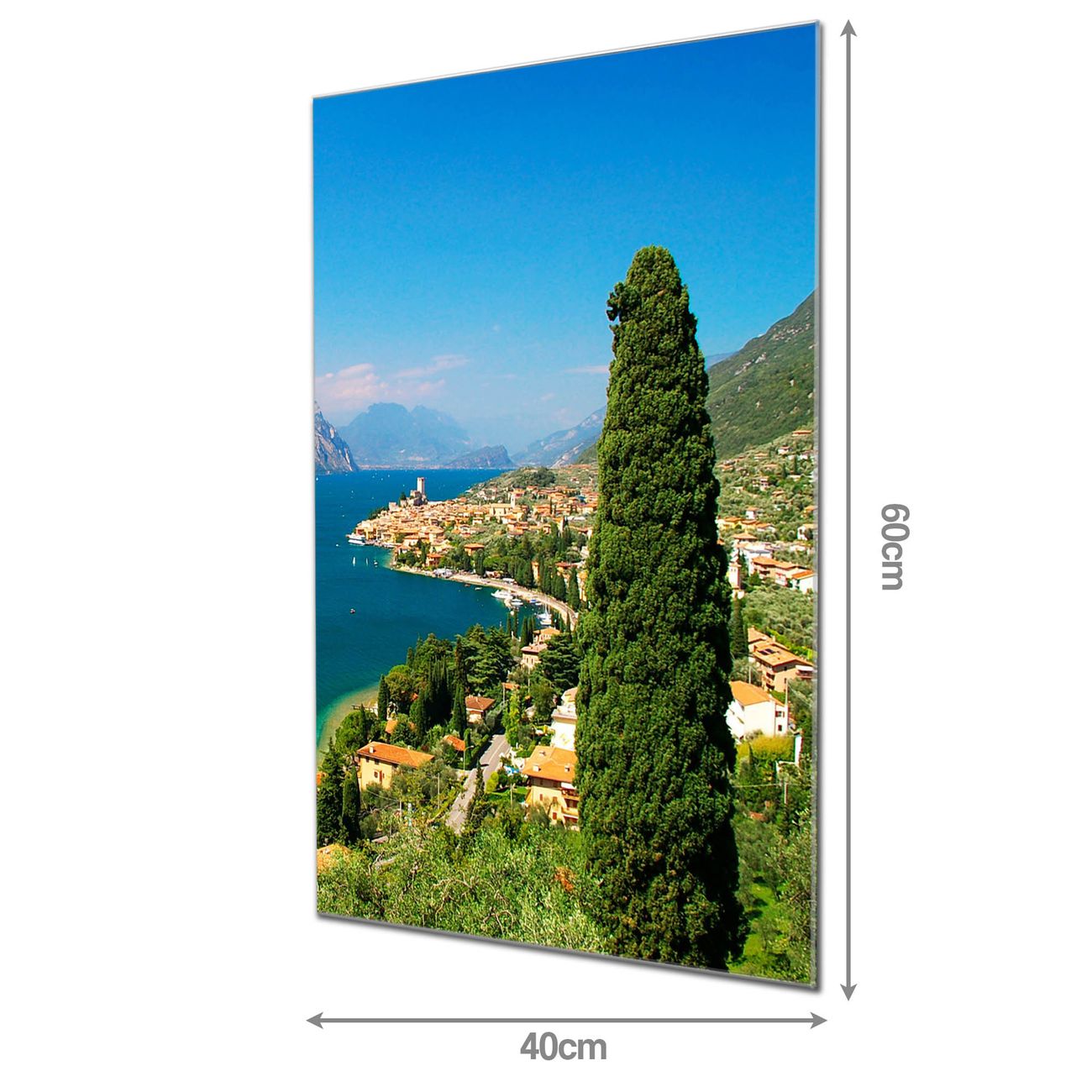 Material: 4mm Sicherheitsglas mit Metallrückwand Eigenschaften: beschreibbar, magnetisch, kratzfest Maße: 40x60x0,6cm, 3,60 kg schwer Motiv Nummer 10009 Gardasee Zubehör: inklusive 4 Neodym-Magnete