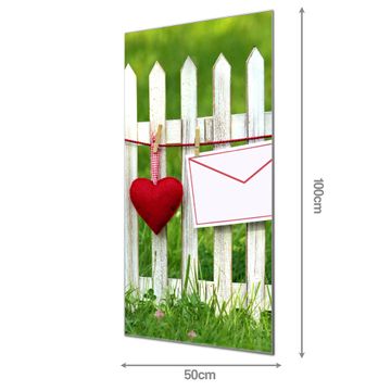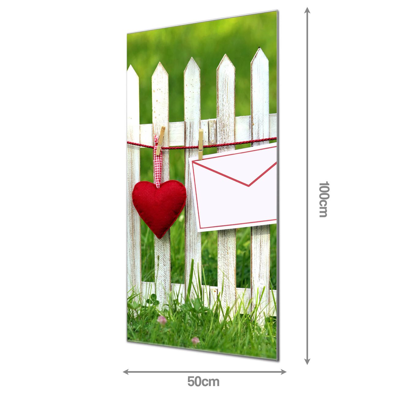 Material: 4mm Sicherheitsglas mit Metallrückwand Eigenschaften: beschreibbar, magnetisch, kratzfest Maße: 50x100x0,6cm, 7,50 kg schwer Motiv Nummer 10375 Gartenzaun Zubehör: inklusive 4 Neodym-Magnete