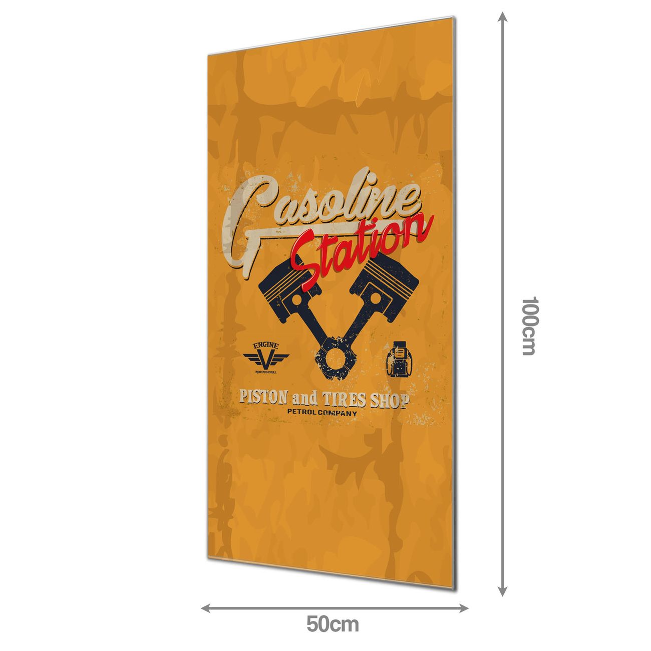 Material: 4mm Sicherheitsglas mit Metallrückwand Eigenschaften: beschreibbar, magnetisch, kratzfest Maße: 50x100x0,6cm, 7,50 kg schwer Motiv Nummer 11147 Gasoline Station Zubehör: inklusive 4 Neodym-Magnete