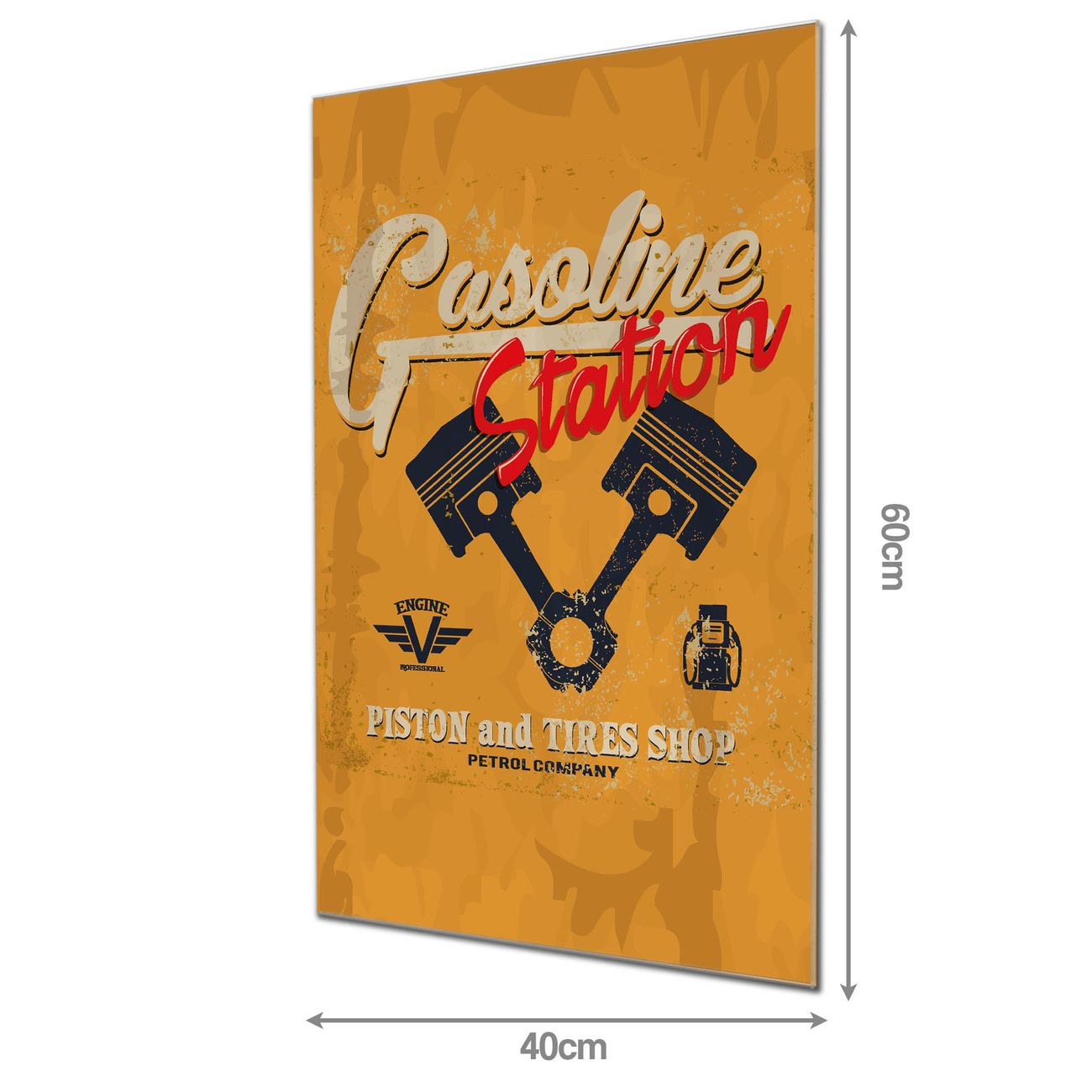 Material: 4mm Sicherheitsglas mit Metallrückwand Eigenschaften: beschreibbar, magnetisch, kratzfest Maße: 40x60x0,6cm, 3,60 kg schwer Motiv Nummer 11147 Gasoline Station Zubehör: inklusive 4 Neodym-Magnete