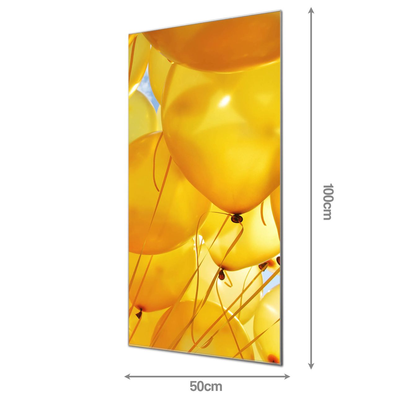Material: 4mm Sicherheitsglas mit Metallrückwand Eigenschaften: beschreibbar, magnetisch, kratzfest Maße: 50x100x0,6cm, 7,50 kg schwer Motiv Nummer 12460 Gelbe Luftballons Zubehör: inklusive 4 Neodym-Magnete