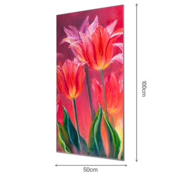 Material: 4mm Sicherheitsglas mit Metallrückwand Eigenschaften: beschreibbar, magnetisch, kratzfest Maße: 50x100x0,6cm, 7,50 kg schwer Motiv Nummer 12310 Gemalte Tulpen Zubehör: inklusive 4 Neodym-Magnete