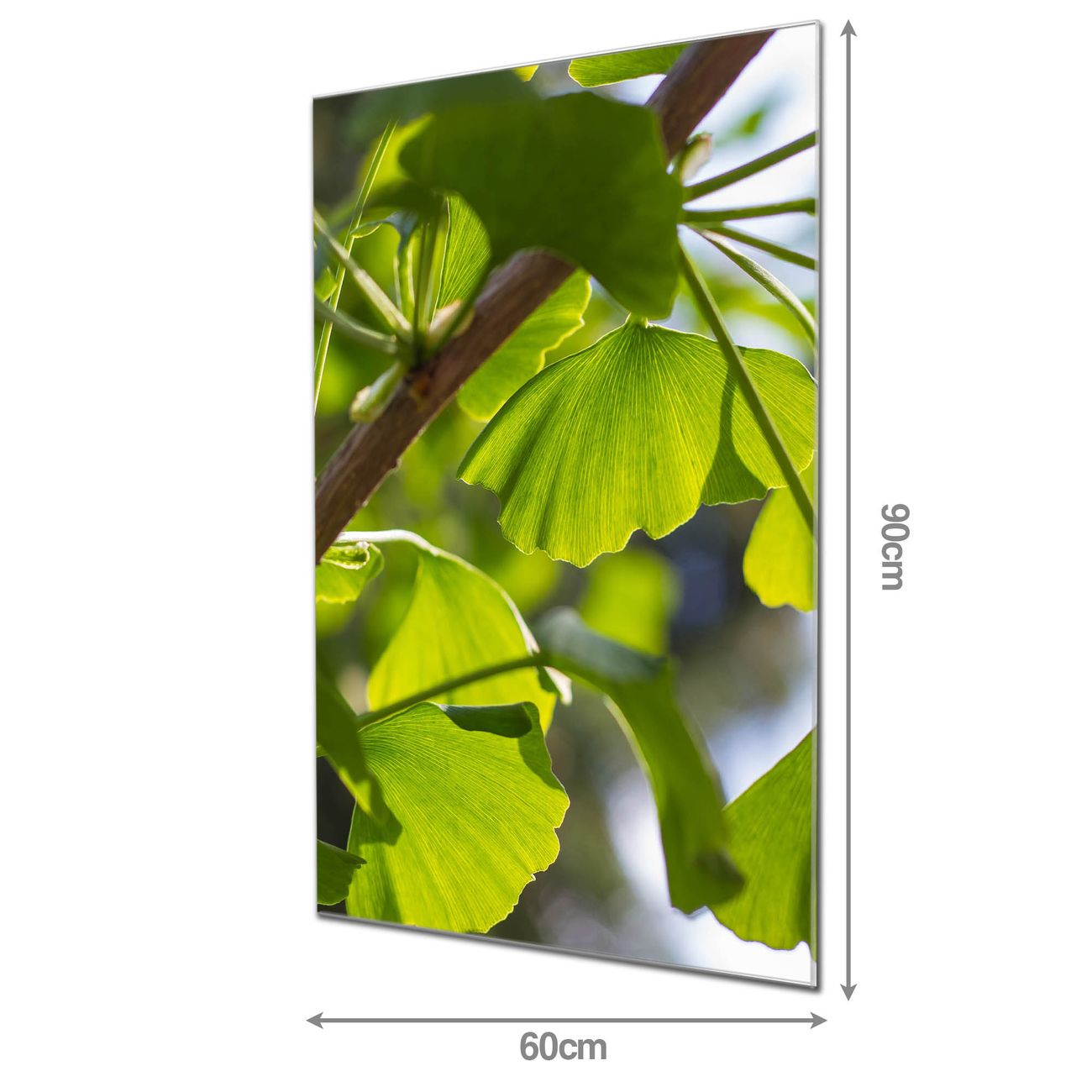 Material: 4mm Sicherheitsglas mit Metallrückwand Eigenschaften: beschreibbar, magnetisch, kratzfest Maße: 60x90x0,6cm, 8,10 kg schwer Motiv Nummer 10537 Gingko Zubehör: inklusive 4 Neodym-Magnete