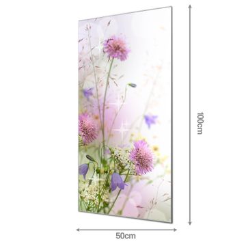 Material: 4mm Sicherheitsglas mit Metallrückwand Eigenschaften: beschreibbar, magnetisch, kratzfest Maße: 50x100x0,6cm, 7,50 kg schwer Motiv Nummer 11269 Glitzernde Wiese Zubehör: inklusive 4 Neodym-Magnete