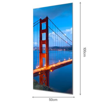Material: 4mm Sicherheitsglas mit Metallrückwand Eigenschaften: beschreibbar, magnetisch, kratzfest Maße: 50x100x0,6cm, 7,50 kg schwer Motiv Nummer 10241 Golden Gate Bridge Zubehör: inklusive 4 Neodym-Magnete