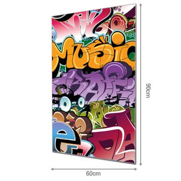Material  4mm Sicherheitsglas mit Metallrückwand Eigenschaften  beschreibbar, magnetisch, kratzfest Maße  60x90x0,6cm, 8,10 kg schwer Motiv  Nummer 10203 Graffiti Zubehör  inklusive 4 Neodym-Magnete