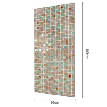 Material: 4mm Sicherheitsglas mit Metallrückwand Eigenschaften: beschreibbar, magnetisch, kratzfest Maße: 50x100x0,6cm, 7,50 kg schwer Motiv Nummer 11375 Grüne Fliesen Zubehör: inklusive 4 Neodym-Magnete
